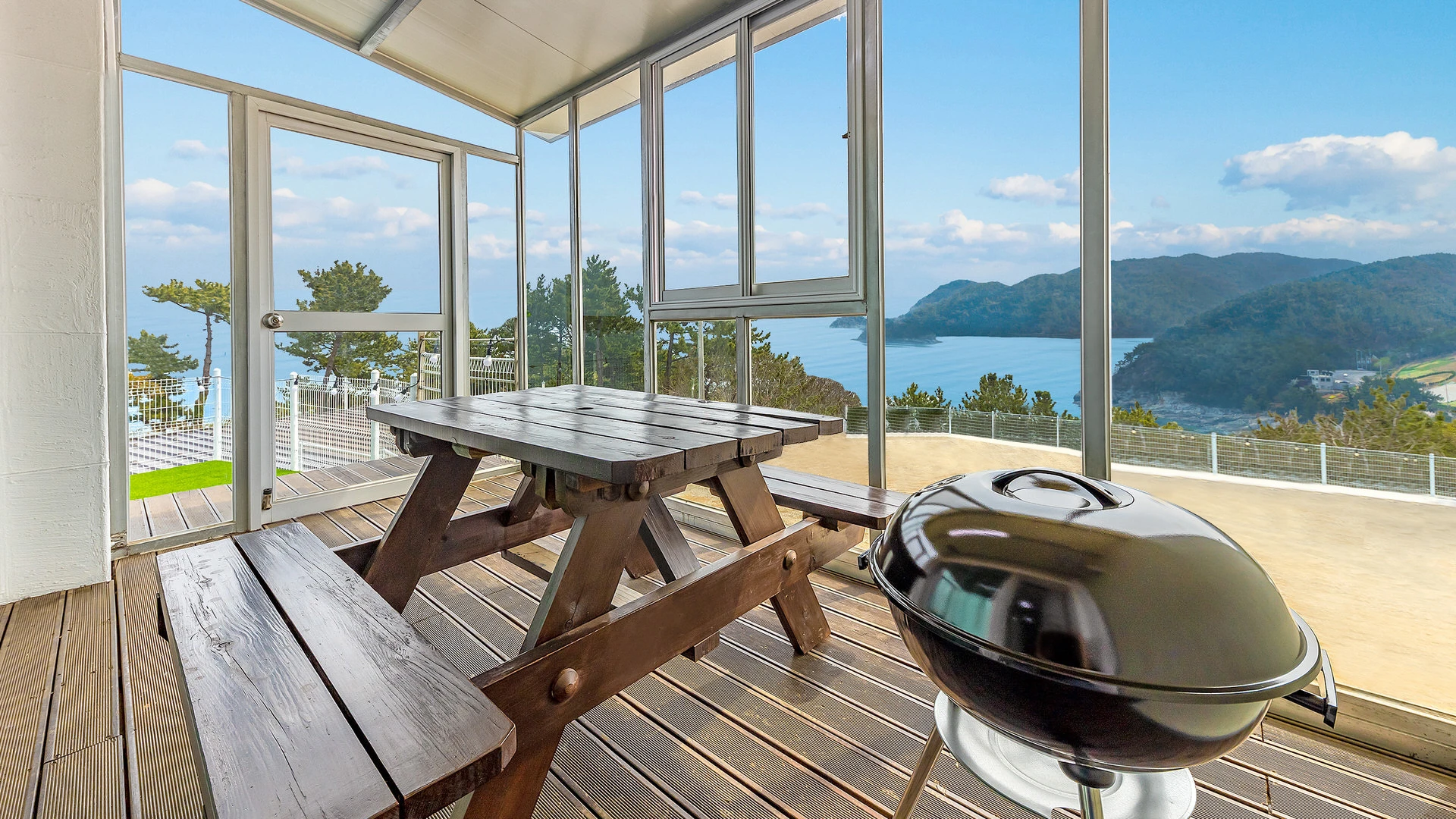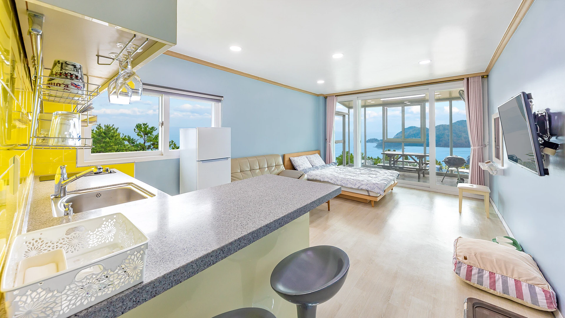 - 집기품목 : TV, 개별바비큐, 냉장고, 드라이기, 세면도구, 와이파이, 에어컨, 인덕션, 전기밥솥, 전자레인지, 테라스, 타월, 취사시설/도구, 욕실용품, VOD, 애견운동장, 정수기, 바다전망